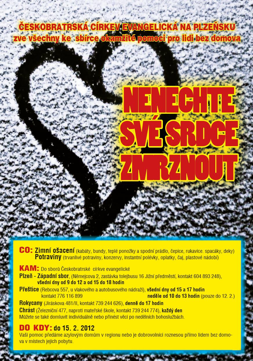 (7.2.2011) Přesně týden mohou lidé na Plzeňsku přispět do sbírky ošacení a potravin pro lidi bez domova. Pod názvem "Nenechte své srdce zmrznout" k ní veřejnost zvou sbory Českobratrské církve evangelické (ČCE). Cílem sbírky je získat okamžitou pomoc pro lidi "na ulici", která jim pomůže přežít současné mrazivé počasí. Šatstvo, deky nebo potraviny pak dobrovolníci předají azylovým domům v regionu nebo je přímo roznesou ohroženým na místa jejich pobytu. Až do středy 15. února mohou lidé přinášet teplé zimní oblečení (kabáty, bundy, rukavice, čepice, teplé ponožky a spodní prádlo), vybavení k noclehu (spacáky, deky) a trvanlivé potraviny (konzervy, instantní polévky, oplatky, čaj a plastové nádobí). Dary občanů rádi převezmou - v kostele západního sboru ČCE v Plzni (Němejcova 2 - zastávka trolejbusu 16 "Jižní předměstí") ve všední dny od 9 do 12 a od 15 do 18 hodin. - na faře ČCE v Rokycanech (Jiráskova 481/II - vedle Komerční banky) denně do 17 hodin - na faře ČCE v Přešticích (Rebcova 557 - u vlakového a autobusového nádraží) ve všední dny mezi 15. a 17. hodinou a v neděli od 10 do 13 hodin (pouze do 12.2.) - na faře ČCE v Chrástu (Železniční 477 - naproti mateřské škole) denně. Karel Šimr farář Českobratrské církve evangelické v Chrástu 739 244 774 V příloze najdete plakát k tisku a také rozhovor J. Blažka z ČRo Plzeň s O. Pellarem, jáhnem evangelického sboru v Plzni - západě a členem PO křesťanské služby.